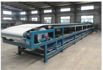 6、膠帶裙邊及擋板:采用EP200 四層聚酯布的環(huán)形橡膠帶,膠帶裙邊采用組合結構即波形裙邊與平行膠帶粘合而成,這種結構裙邊伸縮性好,可避免裙邊經(jīng)過輥筒改向破裂,可防止料液從兩側流出。橡膠帶的上部構造為中間一排排水溝槽,溝槽中間鉆有真空排液孔,鉆空部位為純橡膠無布層,可防止液體通過布層纖維進入橡膠層導致膠帶分層,大大的延長了橡膠帶的使用壽命。
