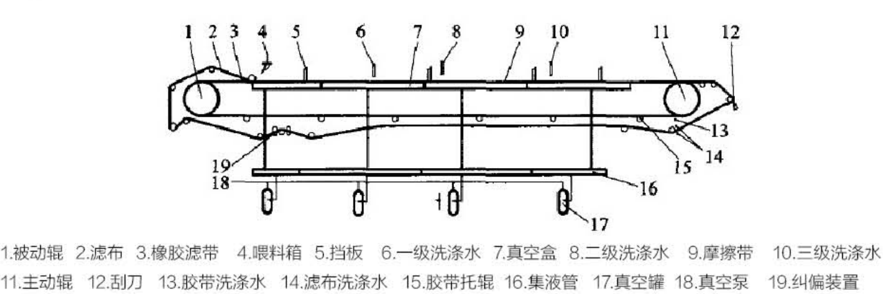該設備采用了固定真空盒,膠帶在真空盒上滑動,真空盒與膠帶間構成運動密封的結構型式。以濾布為介質(zhì),使料漿水平布置于過濾介質(zhì)之上,充分利用料漿重力和真空吸力實現(xiàn)固液分離。它能連續(xù)自動完成過濾、濾餅洗滌、卸渣、濾布沖洗等工藝操作,并且母液、濾餅洗滌液可以分段收集。
