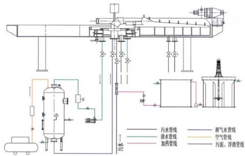 工作原理及構造:利用溶氣系統(tǒng)向水中溶入大量的空氣,形成溶氣水,進入待處理水中,減壓釋放后在水中形成大量的微細氣泡,氣泡與水中 的雜質、絮粒相互粘附,形成比重小于水的浮體,從而快速浮出水面,經刮渣裝置撇除后,完成固、液兩相分離,使水質得到 凈化。主要由池底、撇渣裝置、工作橋與行走裝置、布水布氣裝置、集水裝置、集電裝置組成。